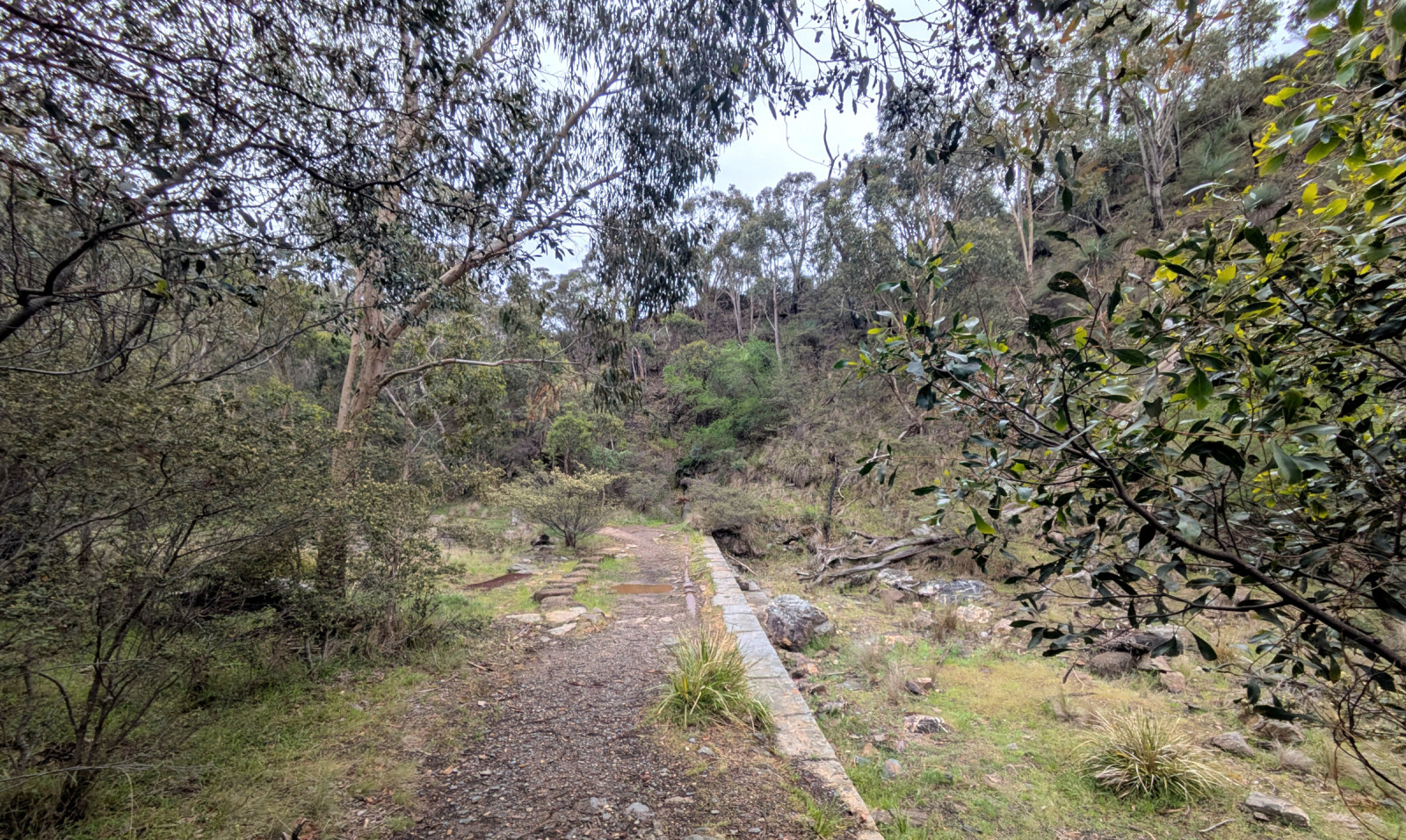 A rocky gully in dry woodland with a nice path for walking.