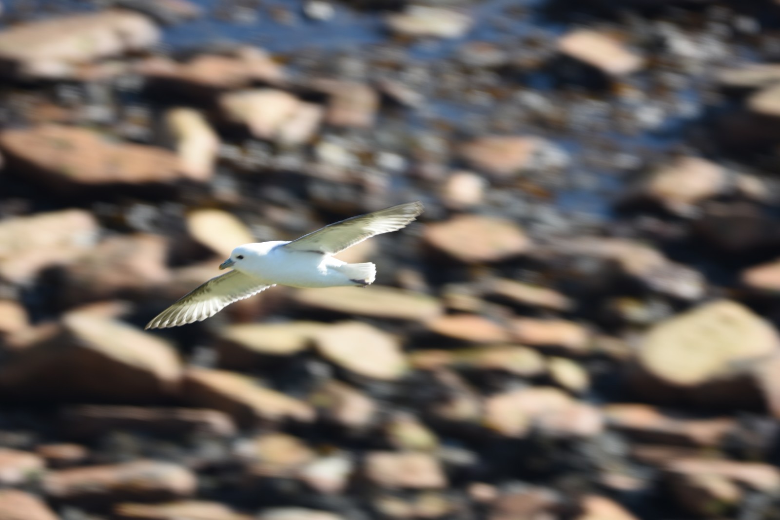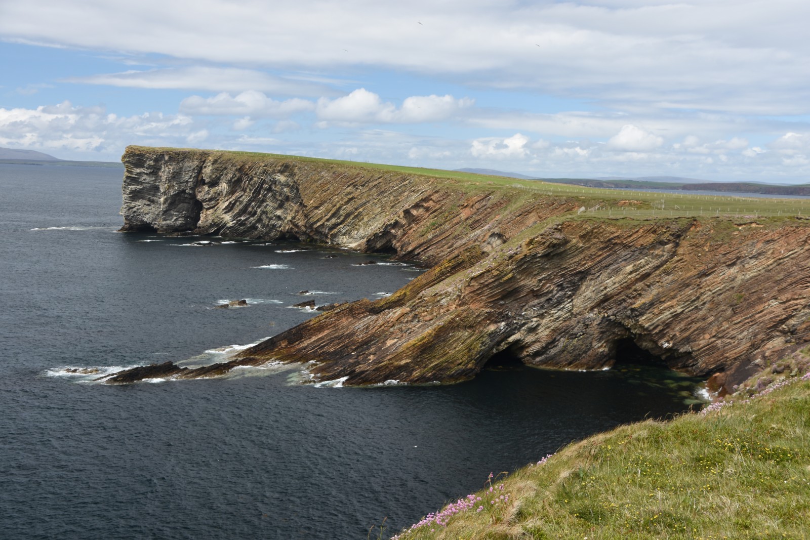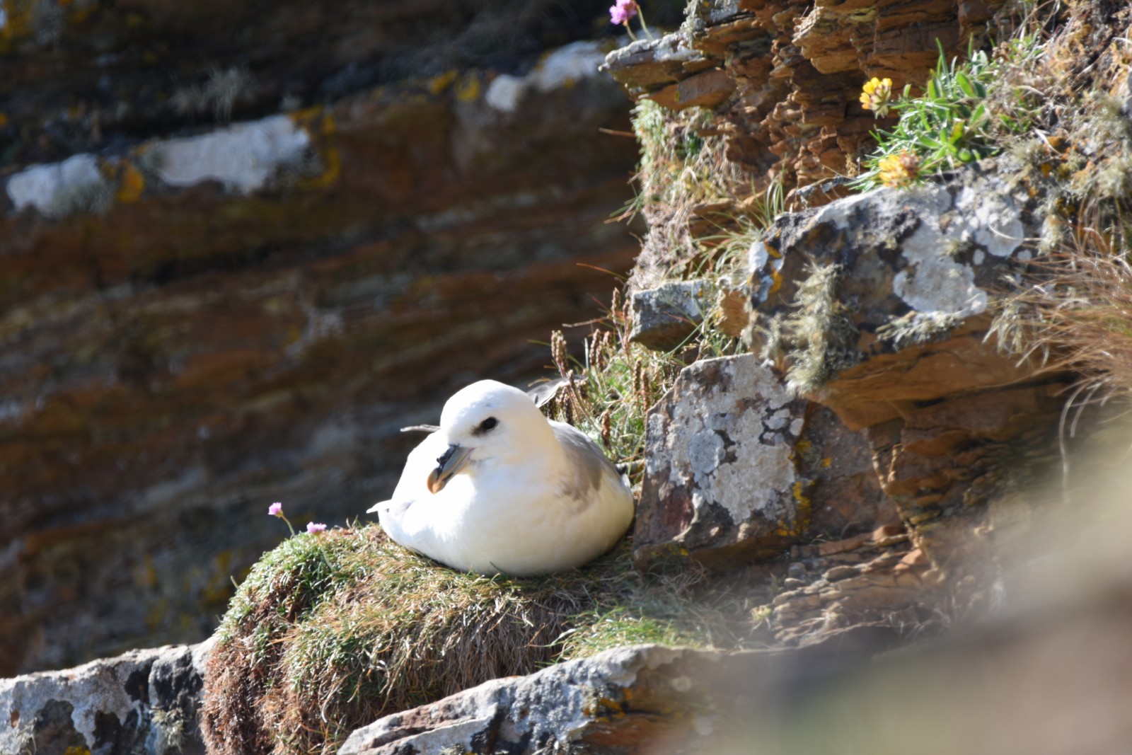 Rocky cliffs with numerous ledges and grassland above them. Indentations allow good sights on breeding seabirds and great views to more southern Islands.