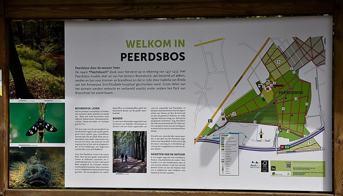 The Peerdsbos is located directly south of Brasschaat. There are several parking spaces around the forest. Click on a P on the map for directions. The circular walk shown on the map is approximately 3.5 km.