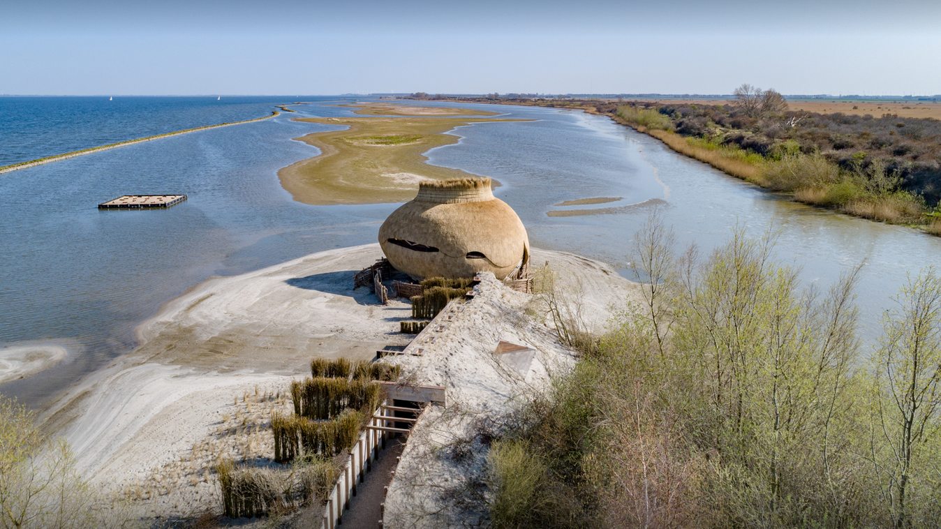 Tij is an egg-shaped bird hide situated in Scheelhoek, a nature reserve close to the Haringvliet sluice near Stellendam. The reserve consists of large reed beds and some flat sand islands with many birds. These islands are breeding and feeding grounds for several species of birds like Visdief, Lepelaar, and the icon of this area, Grote Stern.