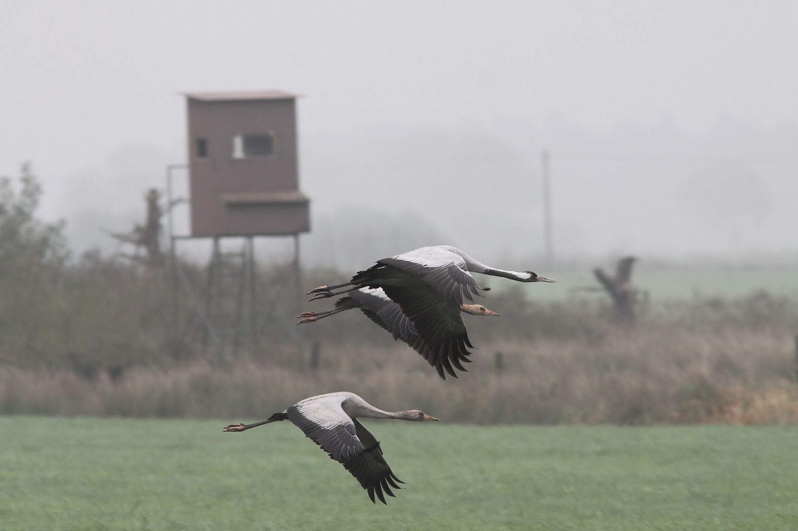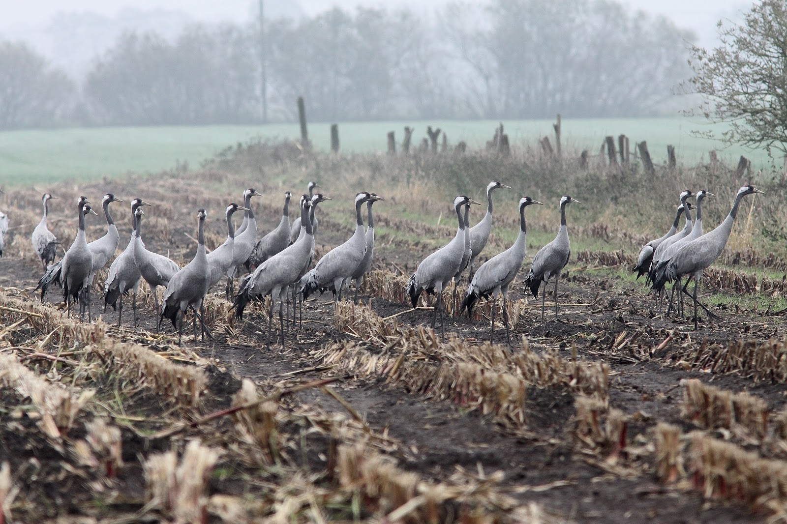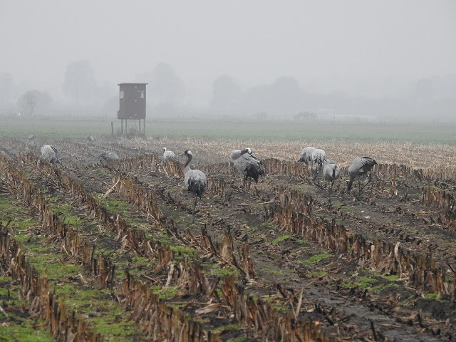 Autodrive in the Diepholz district in Lower Saxony (Niedersachsen) between Vechta and Barnsdorf. Start by sunrise when the Grou-comum go from there nightshelter (Barnsdorfer-Vechtaer moor) to the feeding grounds between Vechta and Barnsdorf. The feeding area is very outstretched in this area but here you find a lot of small roads with flocks of Grou-comum feeding in the farmland.