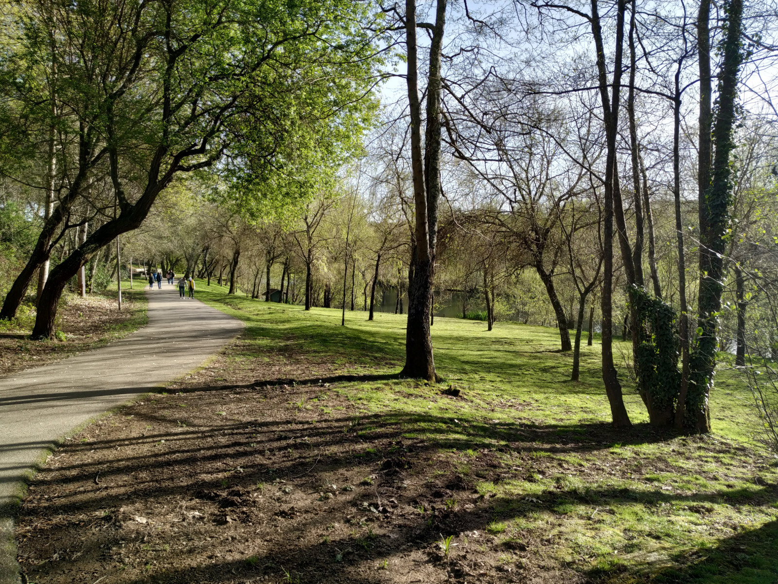 Português: Um parque urbano atravessado por um rio onde com áreas de relva e de vegetação mais densa.