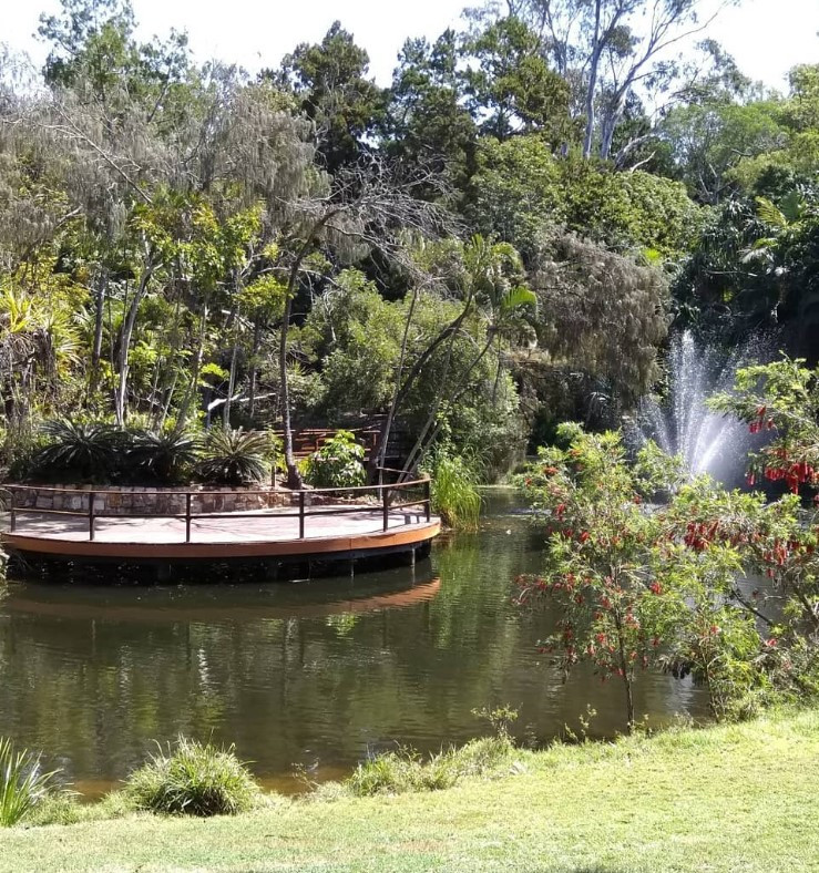 The gardens have expansive lush lawns and large shady trees, a lagoon including fountain in the background, viewing platforms and a bridge allows visitors a close up look at the vast lagoon wildlife. There is also an Australian bush tucker garden to represent the Butchulla people, the original owners of the land. The gardens further include a patch of rainforest and a Chinese inspired formal garden. Over 100 bird species have been identified in the gardens.