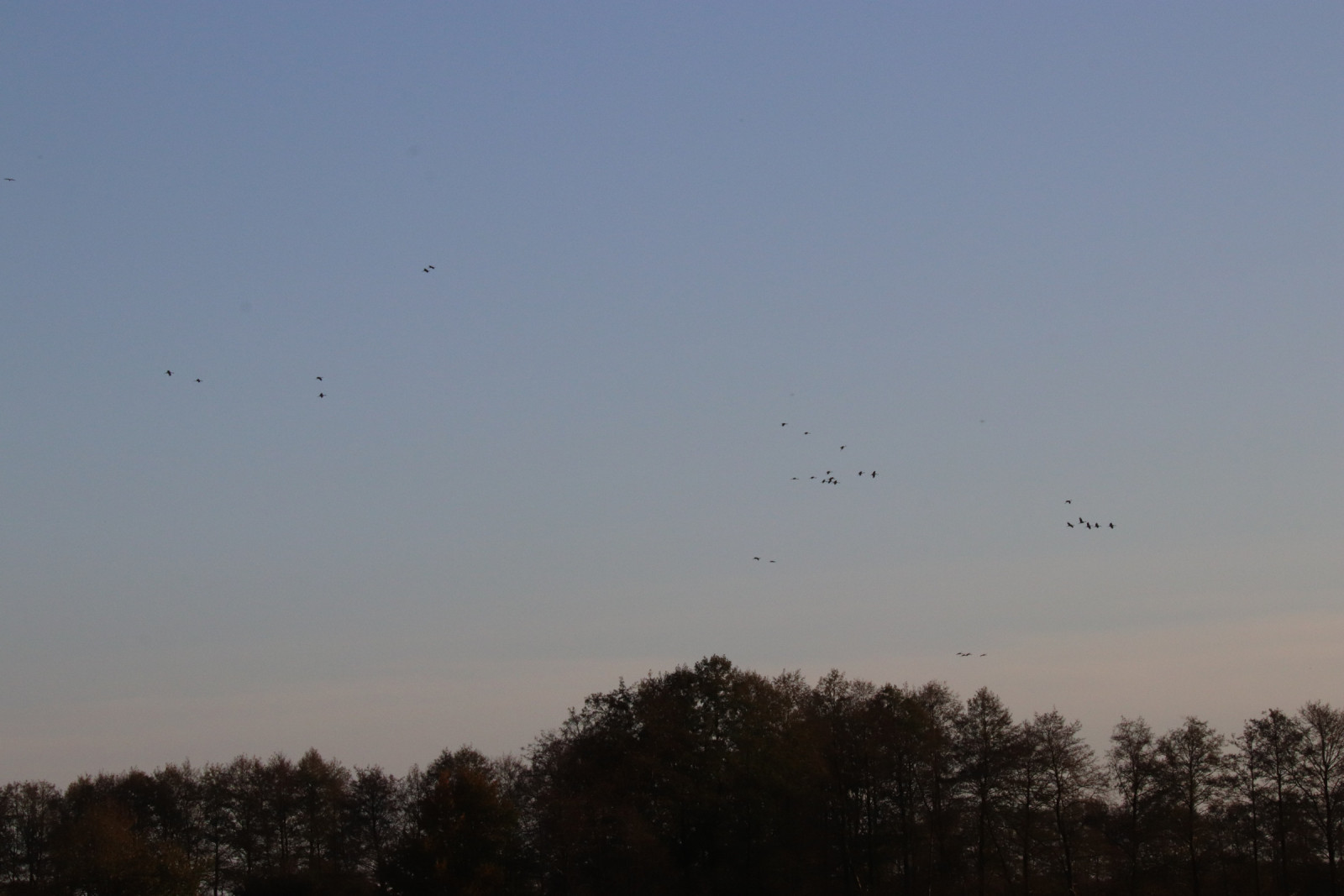 In autumn you can watch flocks of Серый журавль flying to their roosting grounds in the Ostenholz Moor. About an hour before sunset, large and small flocks fly over the area, trumpeting loudly. Of course you can also watch birds here during the rest of the year, but in autumn this place is special.