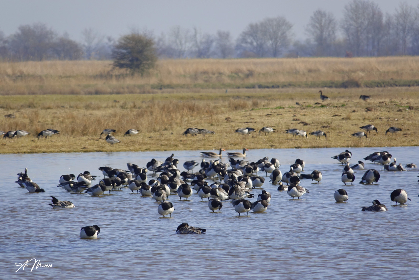 Nature Reserve Wallnau lies on the west coast of the Baltic island of Fehmarn. Click on the P in the map for directions. The nature reserve can be viewed at any time from a path on the crest of the summer dyke. You can make a circular walk around the area of 8 km. Inside the reserve is a shorter 1 km educational trail (Naturerlebnispfad) with several bird hides and an observation tower. The NABU information centre is open from March to October: entry € 10 (NABU-members free ) and houses an exhibition on bird migration and a small restaurant. The trail and bird hides are open all year.