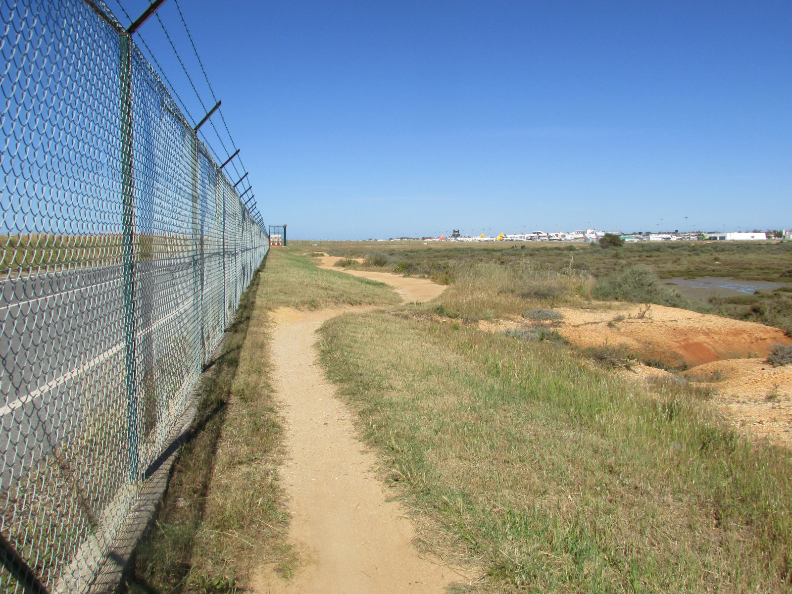 Português: As salinas podem ser acessadas de duas maneiras. A primeira é estacionar o carro no parque de estacionamento da Praia de Faro e utilizar a estrada que percorre a vedação do aeroporto que o levará diretamente até lá, para chegar a esta estrada deve dirigir-se à rotunda atrás do parque de estacionamento e sair na saída na direção oposta à praia. A segunda forma é ir até ao início da Rua Henriques Fernandes Serrão junto ao aeroporto, onde deve seguir em direcção à estação de tratamento para atravessar uma pequena ponte de madeira que conduz a um caminho que margeia o aeroporto e leva directamente ao salinas.